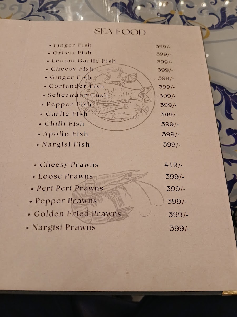 - Seafood Lovers will be delighted by offerings such as Nargisi Prawns and Golden Fried Prawns.